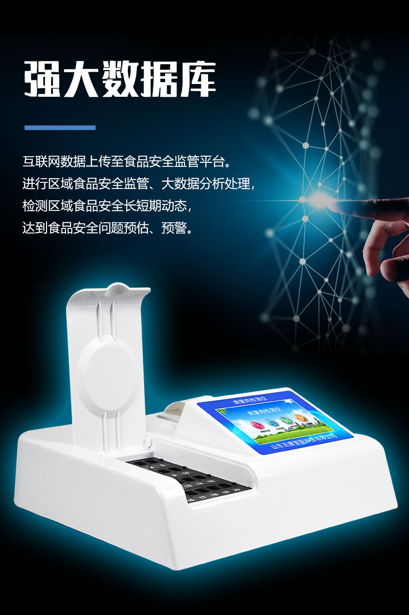 9.6、數(shù)據(jù)監(jiān)管系統(tǒng):同步對(duì)接監(jiān)管平臺(tái),數(shù)據(jù)可局域網(wǎng)和互聯(lián)網(wǎng)數(shù)據(jù)上傳,檢測(cè)結(jié)果可選擇直接傳至食品安全監(jiān)管平臺(tái)。進(jìn)行區(qū)域食品安全監(jiān)管及大數(shù)據(jù)分析處理與數(shù)據(jù)統(tǒng)計(jì),檢測(cè)區(qū)域食品安全長(zhǎng)短期動(dòng)態(tài),達(dá)到食品安全問(wèn)題預(yù)估、預(yù)警。