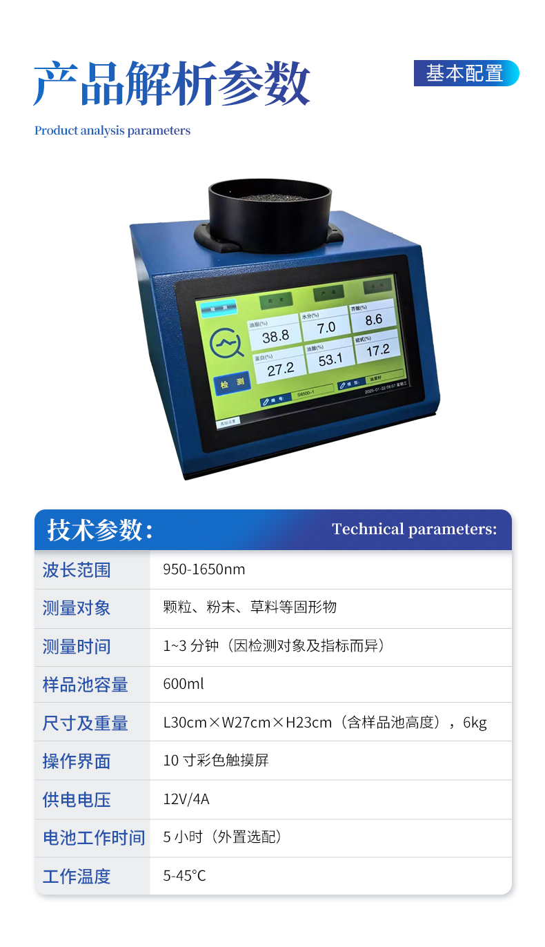 | 波長范圍:950-1650nm | 測量對象:顆粒、粉末、草料等固形物 | 測量時間:1~3 分鐘(因檢測對象及指標(biāo)而異) | 樣品池容量:600ml | 尺寸及重量:L30cm×W27cm×H23cm(含樣品池高度),6kg | 操作界面:10 寸彩色觸摸屏 | 供電電壓:12V/4A | 電池工作時間:5 小時(外置選配) | 工作溫度:5-45℃ |