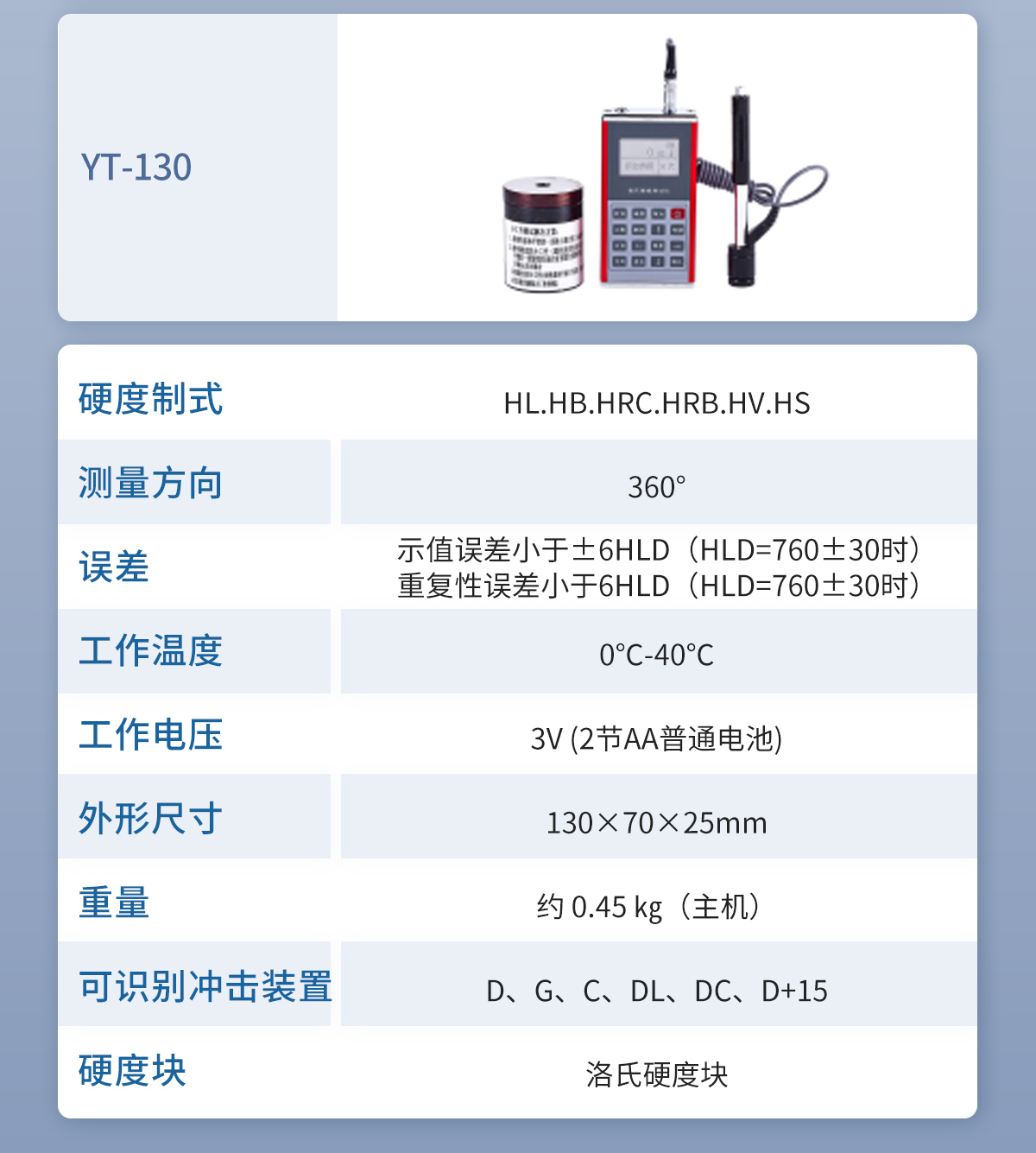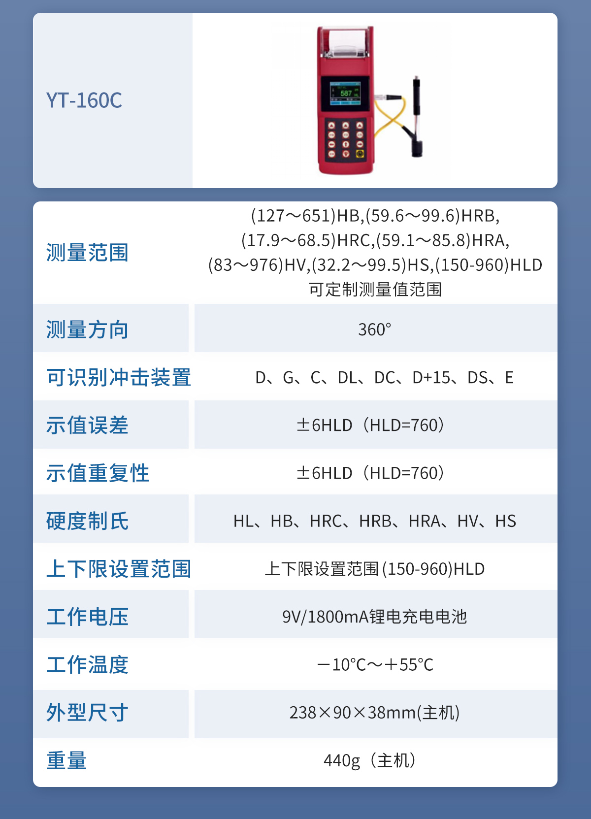 | 測(cè)量范圍 | (127~651)HB,(59.6~99.6)HRB,(17.9~68.5)HRC,(59.1~85.8)HRA,(83~976)HV,(32.2~99.5)HS,(150-960)HLD,可定制測(cè)量值范圍 |