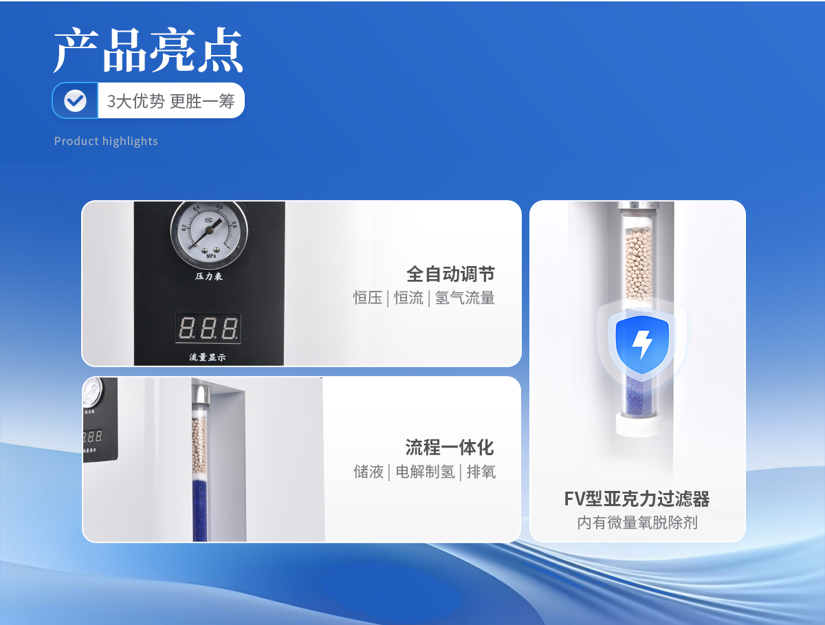 | 1、壓力、流量自動(dòng)顯示,自動(dòng)恒壓、恒流、氫氣流量可根據(jù)用量實(shí)現(xiàn)全自動(dòng)調(diào)節(jié)。 | 2、FV型亞克力過(guò)濾器,內(nèi)有微量氧脫除劑(不需要活化),氫氣純度更高;儀器內(nèi)部采用硅橡膠圈(含硫量低),有效提高氣體質(zhì)量,保證色譜基線平穩(wěn)。 | 3、儲(chǔ)液、電解制氫、排氧一體化,池溫低,壽命長(zhǎng)久。 | 4、配有安全裝置,靈敏可靠,自動(dòng)防返堿。 |