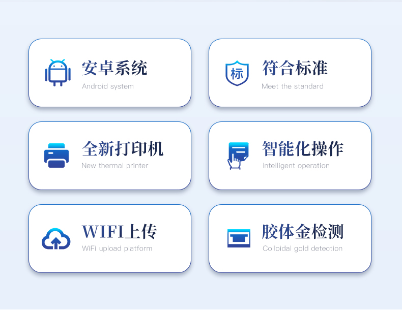 | 1、安卓智能操作系統(tǒng),采用更加**和人性化操作,儀器具有網(wǎng)線連接、wifi聯(lián)網(wǎng)上傳、GPRS無線遠傳功能,快速上傳數(shù)據(jù)。 | 2、智能化程度高,儀器具有自檢功能:具有開機自檢和調(diào)零功能,具有自動檢測重復性功能。 | 3、新一代高速熱敏打印機,檢測完成可自動打印檢測報告和二維碼。 | 4、儀器帶有監(jiān)管平臺,數(shù)據(jù)可局域網(wǎng)和互聯(lián)網(wǎng)數(shù)據(jù)上傳,檢測結(jié)果直接傳至食品安全監(jiān)管平臺。進行區(qū)域食品安全監(jiān)管及大數(shù)據(jù)分析處理與數(shù)據(jù)統(tǒng)計,檢測區(qū)域食品安全長短期動態(tài),達到食品安全問題預估、預警 | 5、一體化主機,包含食品安全檢測模塊、多通道農(nóng)藥殘留檢測模塊、膠體金免疫層析檢測模塊。 | 6、一體化便攜式快檢設備,滿足現(xiàn)場及流動檢測使用需求,能夠在同一軟件下實現(xiàn)所有檢測項目的檢測,并可通過同一窗口直觀顯示檢測結(jié)果。 | 7、膠體金模塊檢測方式:軌道式自動傳輸掃描,檢測完成后自動退出檢測卡。 | 8、CT線自動識別,無需手動調(diào)整。 | 9、儀器具有品類多種類樣品菜單庫,可靈活選擇檢測樣品,不同的檢測通道可同時檢測不同的樣品項目。 | 10、樣品處理簡單省力,整體操作快速、安全、便捷。 | 11、儀器具有自身保護功能,可設置用戶名及密碼,防止非工作人員操作等。 | 12、高靈敏度,高檢測精度,高重復性精度,掃描式高精度光學傳感器。 | 13、內(nèi)置強大的數(shù)據(jù)庫,可在儀器上直接選擇樣品名稱、檢測指標、送檢單位等信息,也可在儀器上直接編輯錄入樣品名稱、檢測指標、送檢單位等信息并保存進樣品數(shù)據(jù)庫。 | 14、儀器具有重新校準、鎖定、恢復出廠設置功能。 | 15、結(jié)果判定線可修改,對照值標定值可保存,斷電不丟失數(shù)據(jù)。 | 16、兼容市場上所有的膠體金卡,使用耗材不受限制,極大增強用戶使用體驗。 |