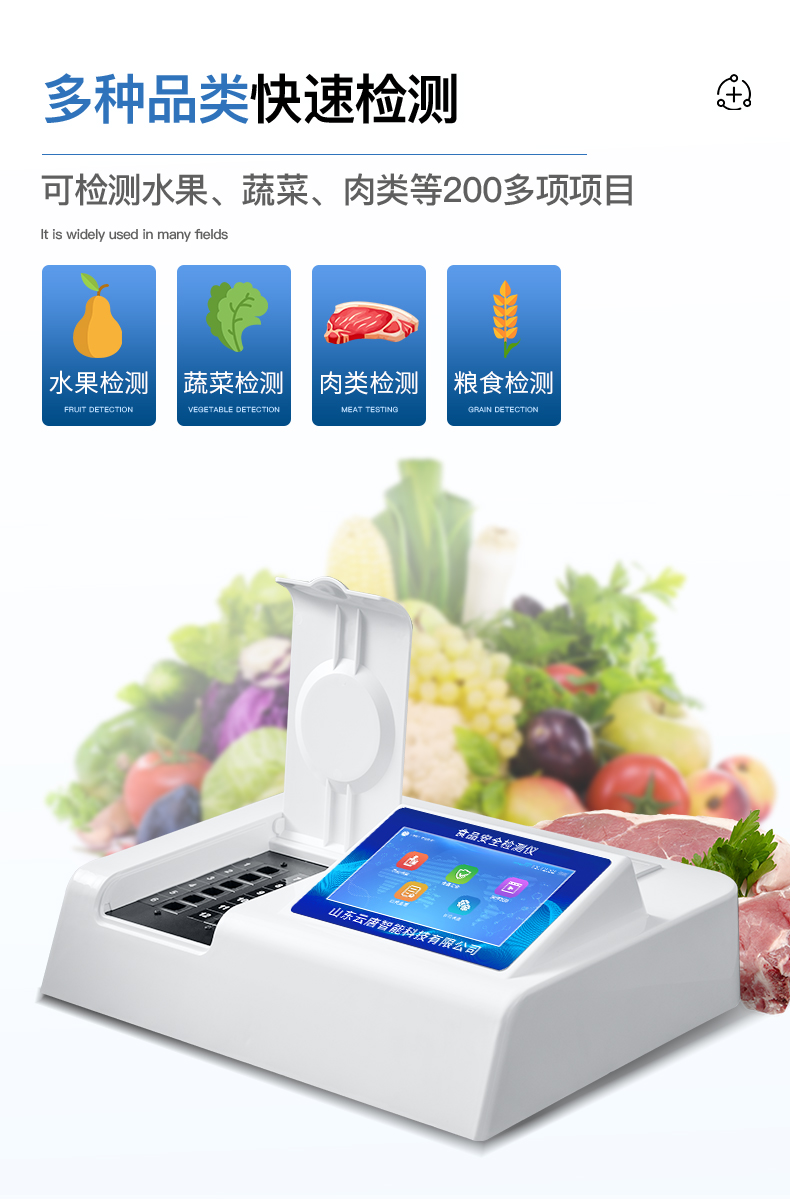 可快速檢測(cè)各類(lèi)食品中的亞硝酸鹽、二氧化硫、甲醛、吊白塊、雙氧水、硼砂、農(nóng)藥殘留、乳及乳制品中蛋白質(zhì)、硝酸鹽、重金屬鉛的含量,儀器預(yù)留其他項(xiàng)目檢測(cè)程序和端口,根據(jù)日后需求可方便的自主增加檢測(cè)項(xiàng)目。