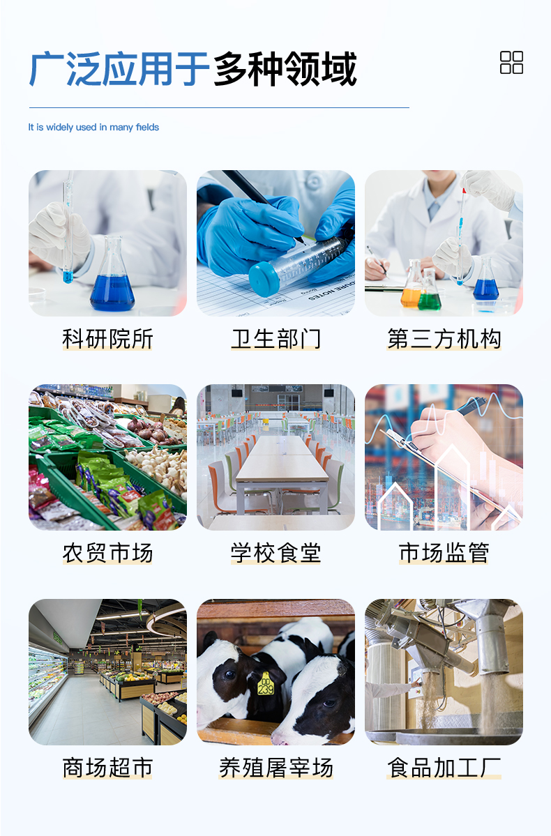 該多功能食品安全檢測(cè)儀為集成化食品安全快速檢測(cè)分析設(shè)備,廣泛應(yīng)用于食藥監(jiān)局、衛(wèi)生部門、高教院校、科研院所、農(nóng)業(yè)部門、養(yǎng)殖場(chǎng)、屠宰場(chǎng)、食品肉產(chǎn)品深加工企業(yè)、檢驗(yàn)檢疫部門等單位使用。