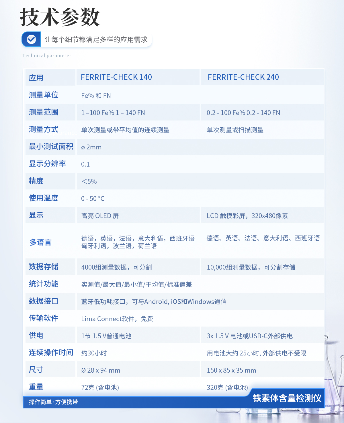 鐵素體含量檢測(cè)儀操作簡(jiǎn)單 List-Magnetik公司 FERRITE-CHECK 140鐵素體含量檢測(cè)儀是一款設(shè)計(jì)緊湊、使用方便的便攜儀器,儀器配有集成探頭,儀器符合Basel標(biāo)準(zhǔn)DIN EN ISO 8249,使用磁感應(yīng)法測(cè)量奧氏體鋼和雙相鋼中的鐵素體含量。 高亮OLED顯示鐵素體含量 FERRITE-CHECK 140鐵素體含量檢測(cè)儀只有一個(gè)按鈕,并配有多語(yǔ)言菜單導(dǎo)航,非常易于使用。高亮度OLED屏顯示FN或Fe%的測(cè)量結(jié)果。 測(cè)量焊縫中的鐵素體含量 特別是對(duì)于焊接的雙相鋼,重要的是要知道焊縫是否有足夠的鐵素體含量來(lái)保證焊縫的強(qiáng)度。鐵素體含量低的話,焊縫受熱后較容易產(chǎn)生裂紋,但如果鐵素體含量過(guò)高,焊縫的韌性和延展性將會(huì)喪失。 快速連續(xù)鐵素體含量測(cè)量 使用FERRITE-CHECK 140鐵素體含量檢測(cè)儀,可以非常準(zhǔn)確和快速地測(cè)定鐵素體含量。檢測(cè)光滑或拋光表面上的焊縫時(shí),可以將儀器切換到快速連續(xù)測(cè)量模式。當(dāng)探頭放置在表面上并沿表面移動(dòng)時(shí),測(cè)量值將連續(xù)存儲(chǔ),在提起探頭后,屏幕將顯示的*小值、**值和平均值組成的統(tǒng)計(jì)信息。 校準(zhǔn)鐵素體含量檢測(cè)儀 FERRITE-CHECK 140鐵素體含量檢測(cè)儀配有3個(gè)校準(zhǔn)標(biāo)準(zhǔn)片,可追溯到NIST 管理和發(fā)送測(cè)量數(shù)據(jù)與免費(fèi)的應(yīng)用程序 為了進(jìn)一步處理測(cè)量數(shù)據(jù),您可以將FERRITE-CHECK 140鐵素體含量檢測(cè)儀與移動(dòng)Android和iOS設(shè)備配對(duì)?;蛘吲c一臺(tái)Windows電腦通信。這是由低功耗藍(lán)牙技術(shù)(BLE)實(shí)現(xiàn)的。使用Lima Connect應(yīng)用程序,您可以管理項(xiàng)目并在照片上分配測(cè)量點(diǎn)。測(cè)量結(jié)果可以統(tǒng)計(jì)評(píng)估和圖形顯示。這款應(yīng)用適用于安卓、iOS和Windows系統(tǒng),軟件免費(fèi)的。