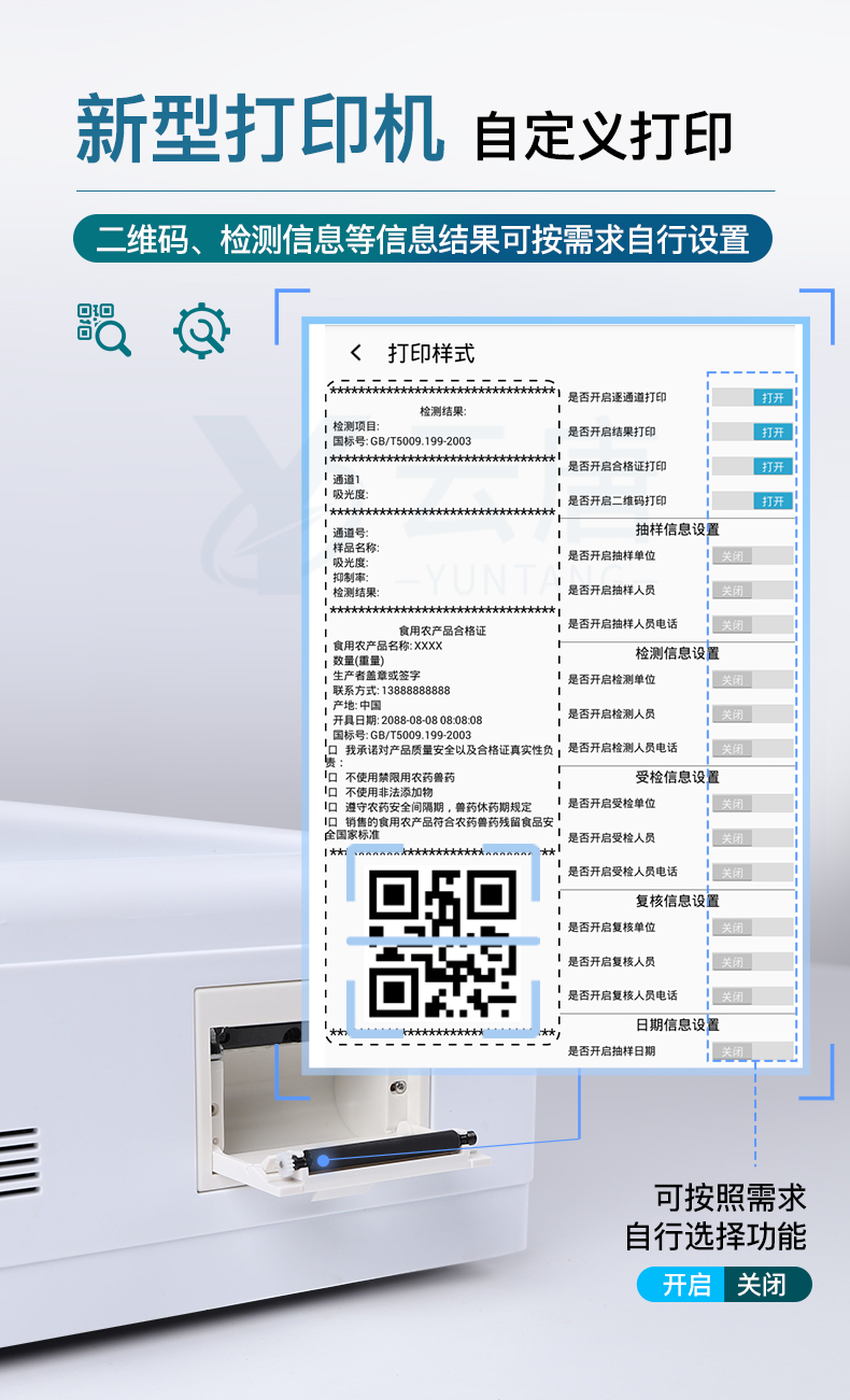 9.7.1、全新打印系統(tǒng):內(nèi)置全新打印機(jī),新創(chuàng)自定義打印方式,可按需靈活勾選控制:產(chǎn)品合格證(國(guó)家農(nóng)業(yè)部標(biāo)準(zhǔn)要求),二維碼,抽樣信息、檢測(cè)信息,受檢信息、復(fù)核信息、抽樣日期、檢測(cè)日期等信息的打印。