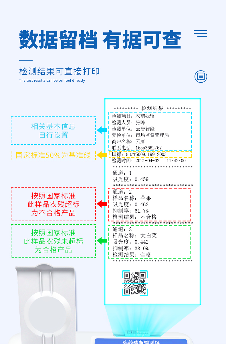 2、智能化程度高,儀器具有自檢功能:具有開機自檢和調(diào)零功能,具有自動檢測重復性功能;同時,檢測完成可自動打印檢測報告和二維碼。手機掃碼可顯示出詳細檢測信息。