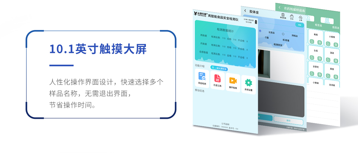 1、儀器采用手提式一體化系統(tǒng)檢測技術(shù),將分光光度模塊、膠體金檢測模塊、新型農(nóng)殘檢測模塊、數(shù)字化管理模塊、無線通訊模塊高度集成于一體,支持檢測200種食品安全檢測項目,同時預(yù)留升級檢測方法。
