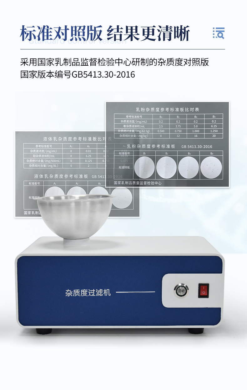 | 用途:用于乳及乳制品中雜質度的測定。 | 標準依據(jù):符合國家標準 GB/T5413.1—5413.32,特別是 GB5413.30-2016 的要求。 |